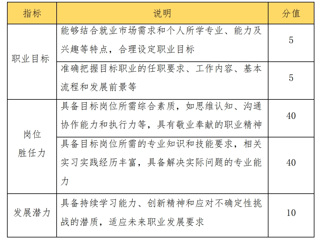 考察学生求职实战能力,对照目标职业及岗位要求,个人综合素质和专业能力等方面的契合度,个人发展路径与就业市场需求的适应度。