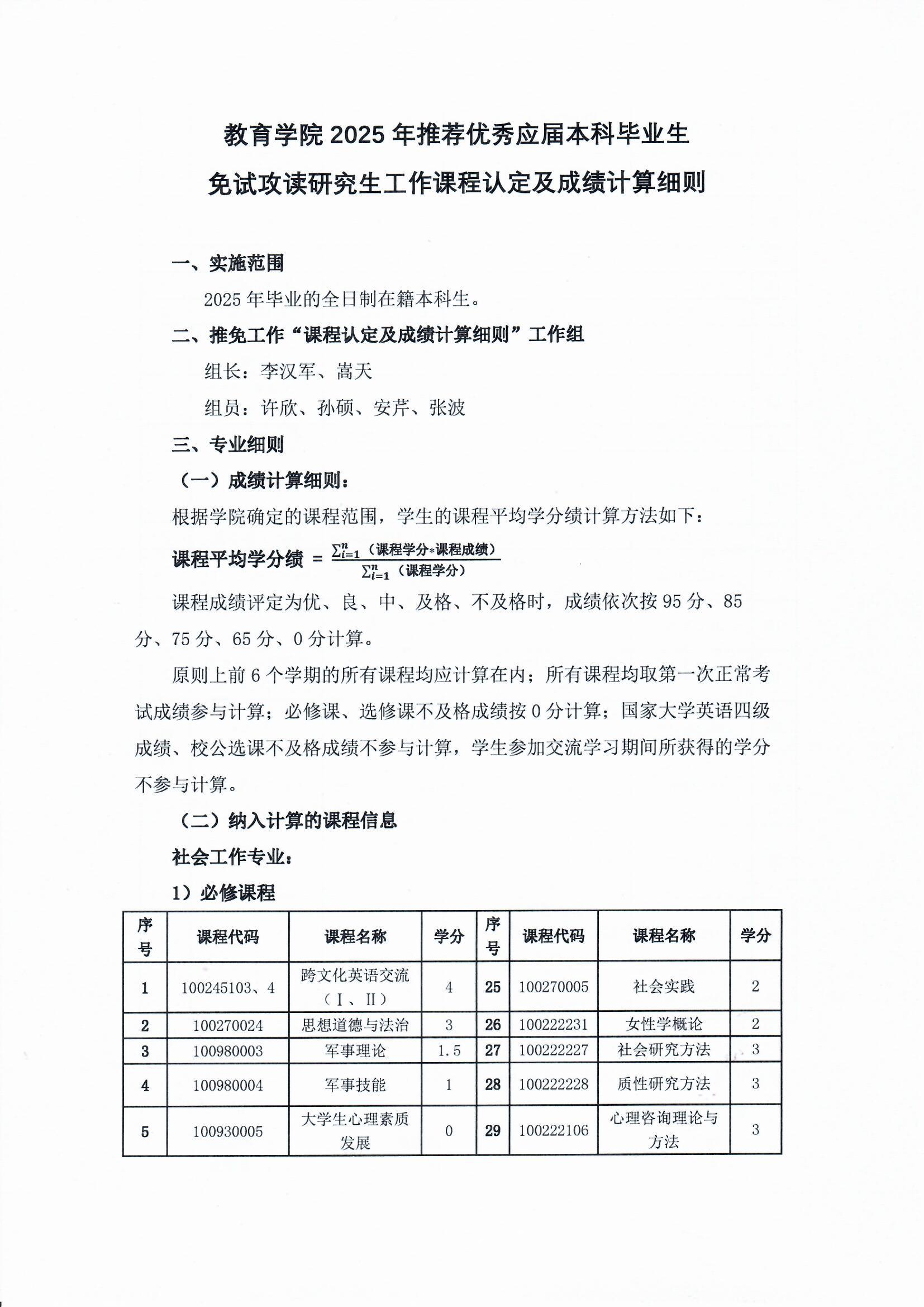 304永利登录入口2025年推荐优秀应届本科毕业生免试攻读研究生工作课程认定及成绩计算细则