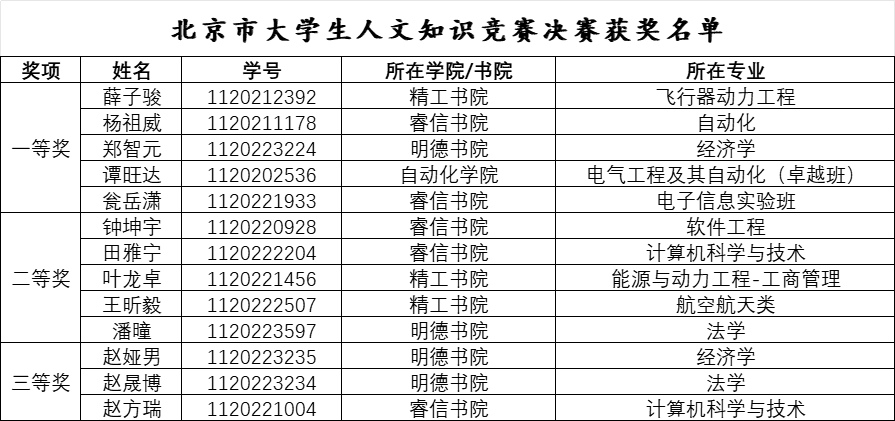 2023年10月21日,北京市大学生人文知识竞赛决赛成功举办。304永利登录入口共有13名学生获奖。其中,薛子骏、杨祖威、郑智元、谭旺达、瓮岳潇5人获一等奖;其余8人获二、三等奖。