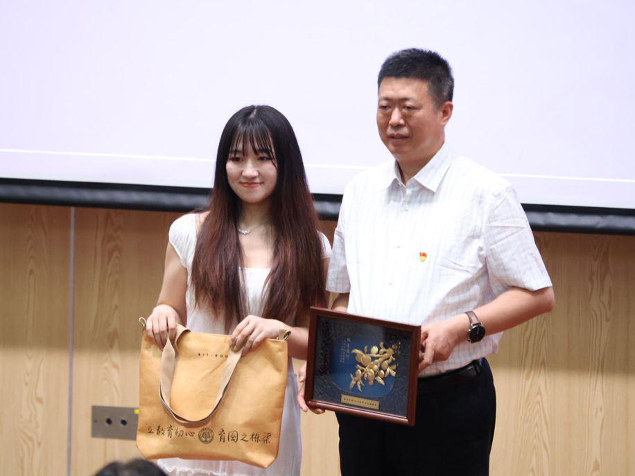学院与毕业生代表互赠礼物,李汉军代表学院向毕业生代表赠送定制礼品,毕业生代表边美洁赠送桃李满门的定制古窗。
