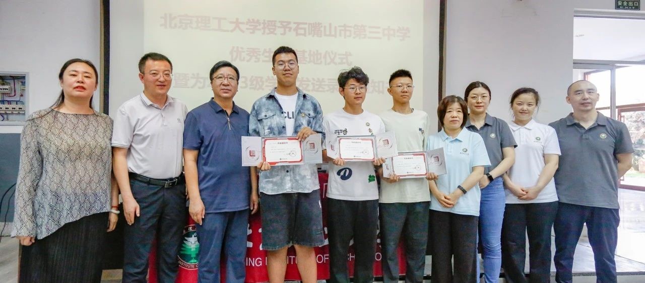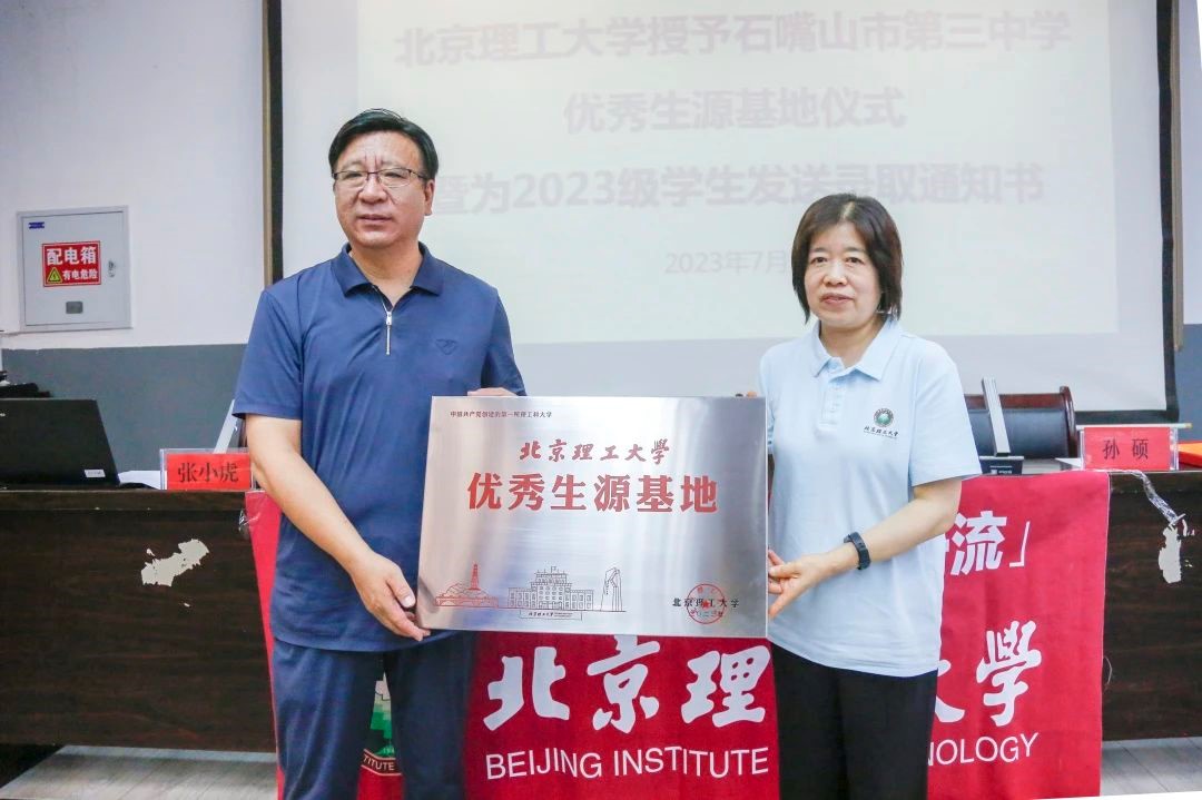 7月24日,研学团师生回到石嘴山三中,参加招生组向学校颁授优秀生源基地暨录取新生通知书发放仪式,招生组组长娄秀红向校长王世波赠送录取喜报并为学生亲手送上录取通知书。宁夏录取理科第一名、全区第78名的靳杰熙同学代表新生发言。