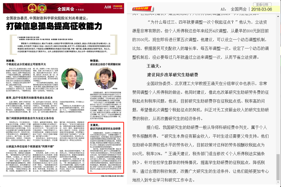 全国政协委员、304永利登录入口光电学院教授王涌天委员作为一名老委员,去年十二届政协五次会议上,就递交了一份“关于减轻研究生助研劳务费税负的提案”,他认为作为导师,发给学生助研费,既为了帮助研究生克服生活困难,同时也是对他们付出劳动的尊重,奖励他们在科学研究中做出的贡献。但是我国现行的劳务费征税办法从800元到20000万,都征收20%的税费,很不合理。今年当听到总理所做的政府工作报告中提出“个人所得税起征点将提升”这句话,王涌天委员心中感到一丝欣慰,王涌天表示非常希望能够借此契机纠正对无工资薪金收入的研究生人群的不合理的收税现象,改善广大研究生的生活条件,使他们能够更加专心地投入到专业学习和研究工作中去。他认为作为老师,要关心学生的切身利益,要帮他们呼吁一些事情;作为政协委员,看到社会经济生活中不合理的事情,我也要发声呼吁。